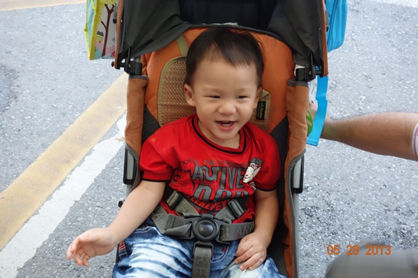 走路的過程中,把弟弟稀飯餵完了,哥哥則在推車上睡著補眠。。。