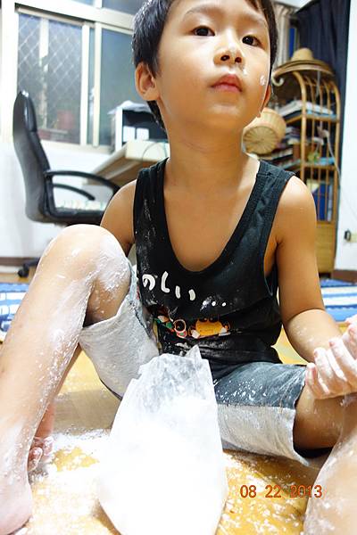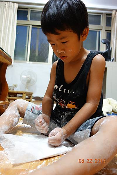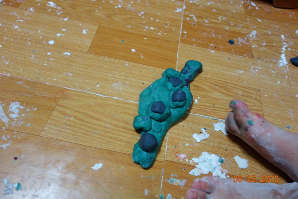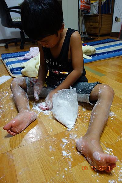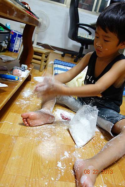 回家午覺後開始玩黏土,進入可加色素階段(前一天只費力的把麵糊調好)