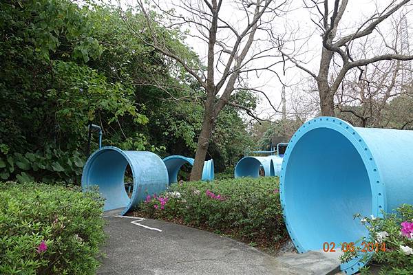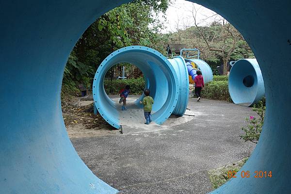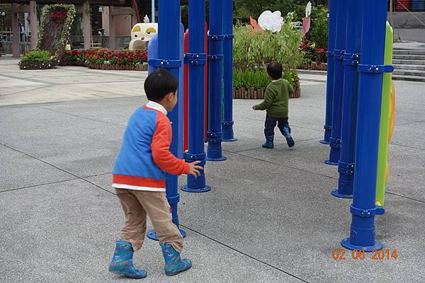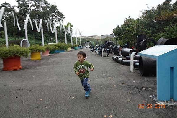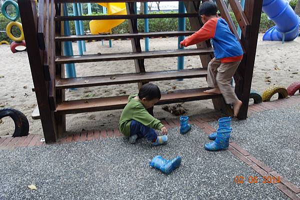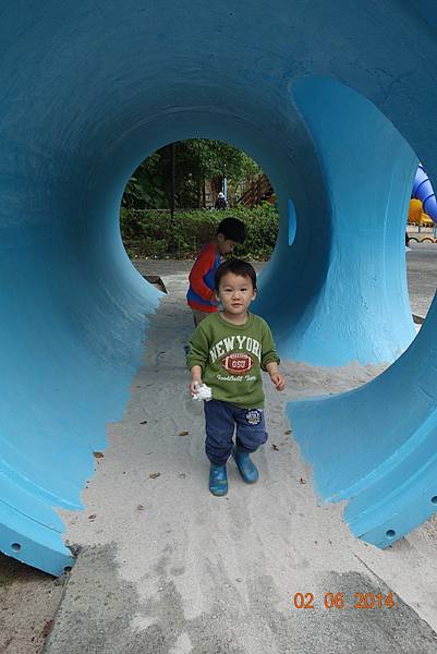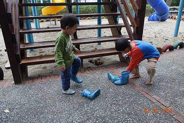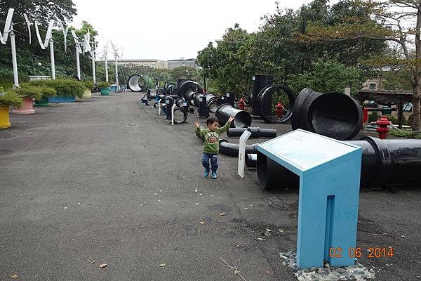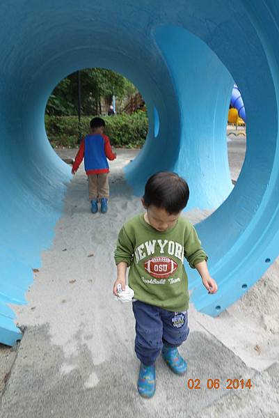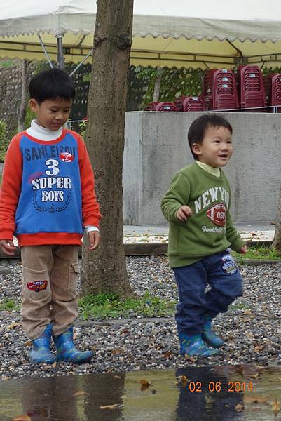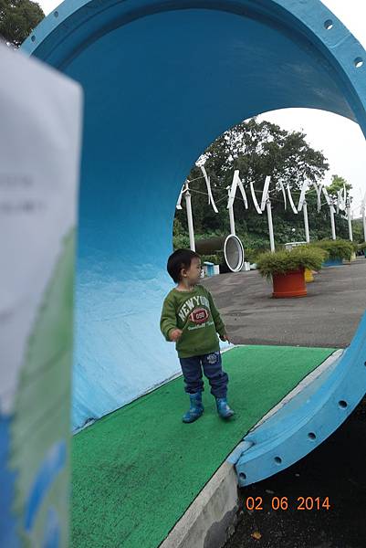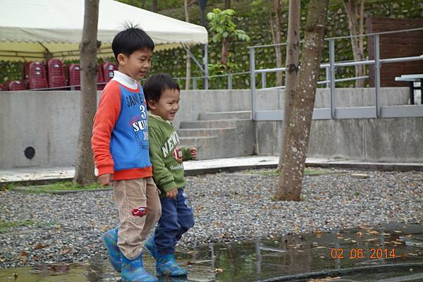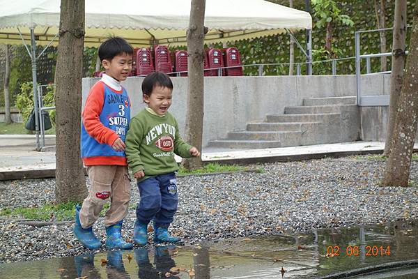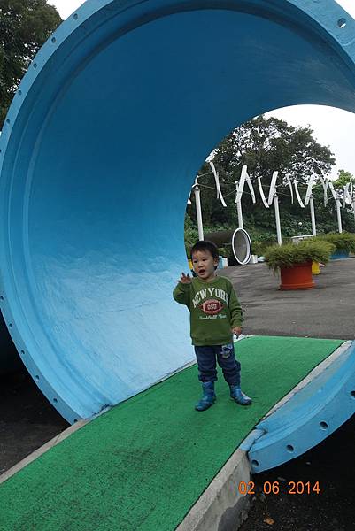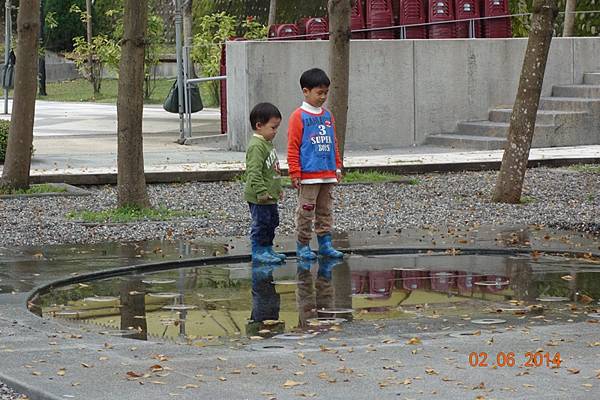 堅持穿雨鞋出來的兩人, 很高興的在水管中來回踩水~~~